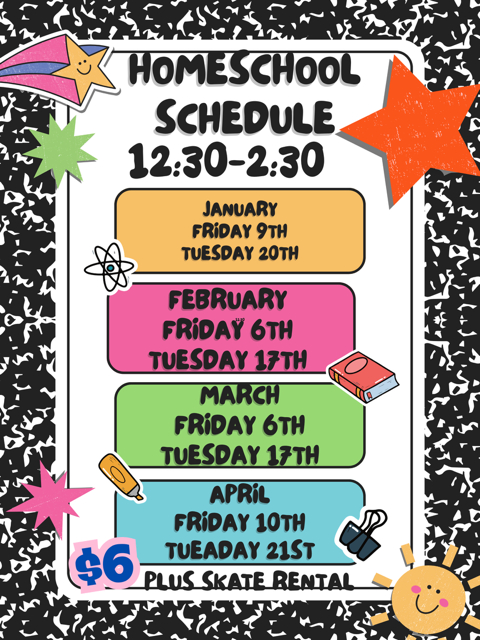 We have regular weekly public sessions offering a full-service snack bar, arcade games, pro-shop, and we must not forget the stuff-shop with all the fun glow in the dark and light-up items as well as candy that the kids are crazy about! We have extended hours when the kids are out on school break and summertime. We host a LATE SKATE event every NEW YEAR'S EVE!